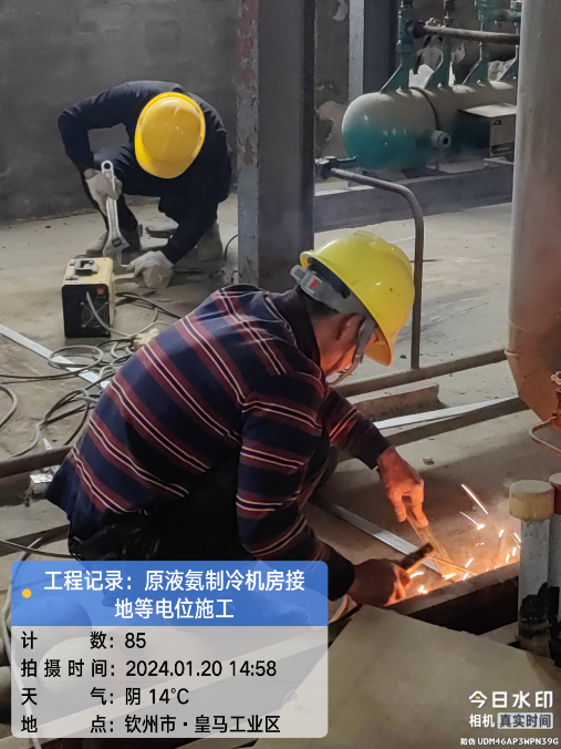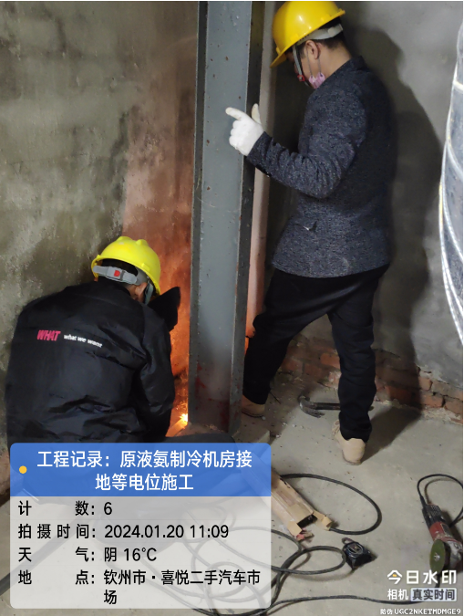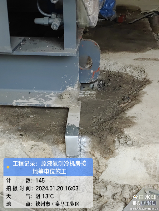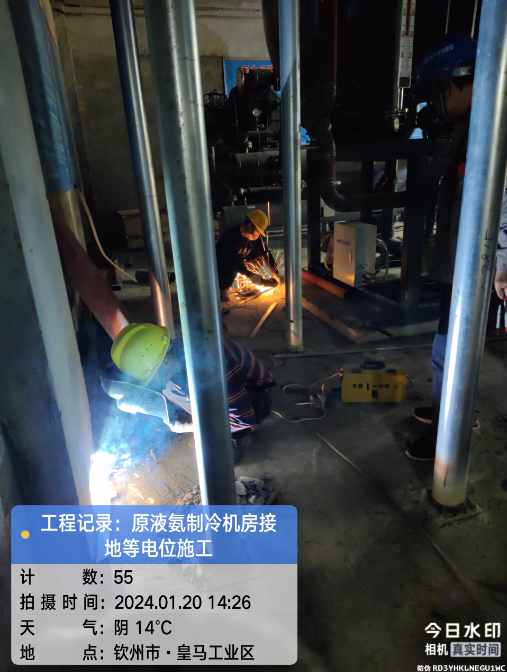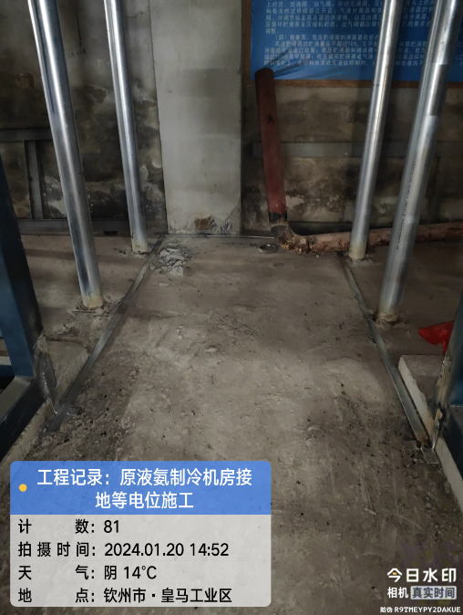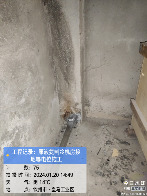 由我公司负责实施的广西自贸区临海供应链有限公司冷链仓储物流加工车间设备接地引下线预埋项目于2024年1月20日在完成原液氨机房接地等电位施工后顺利结束。详见下图: