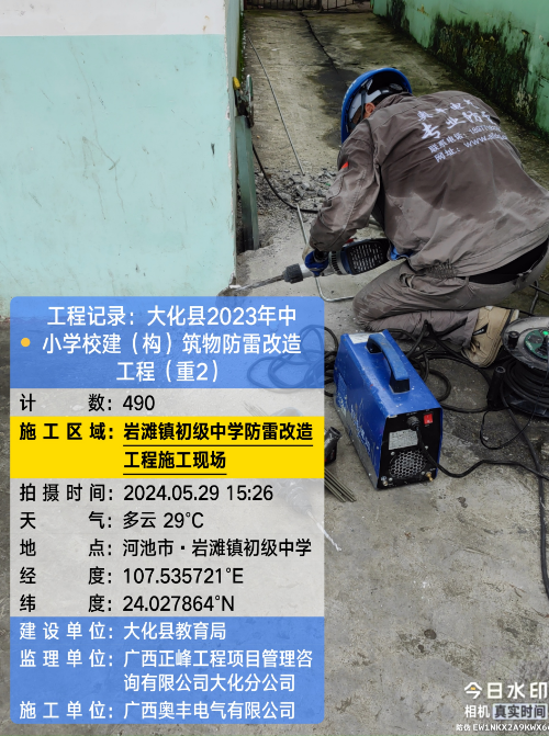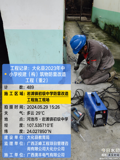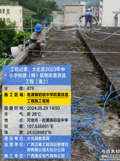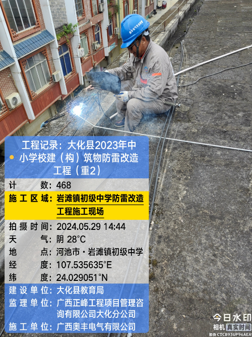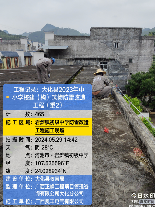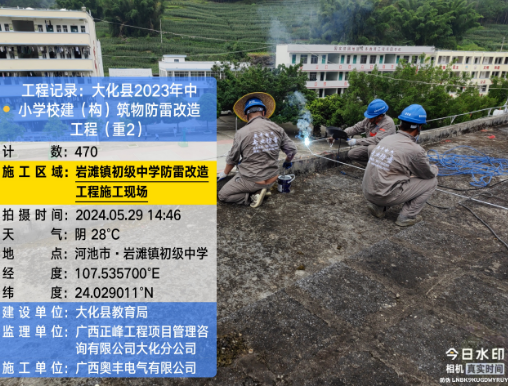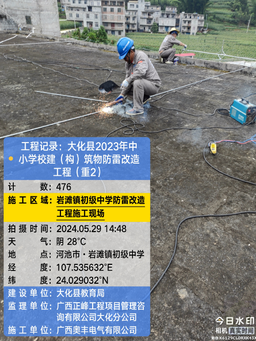 由我公司中标实施的大化瑶族自治县2023中小学校建(构)筑物防雷改造工程(重2),我方施工人员2024年3月26日正式进场施工以来,至2024年5月29日止,已经完成了雅龙乡初级中学、雅龙乡中心小学、共和乡中心小学、贡川乡中心小学、百马乡中心小学、古河乡中心小学、都阳镇中心小学、都阳镇初级中学以及岩滩镇中心小学全部的施工任务。下图为岩滩镇初级中学防雷施工现场: