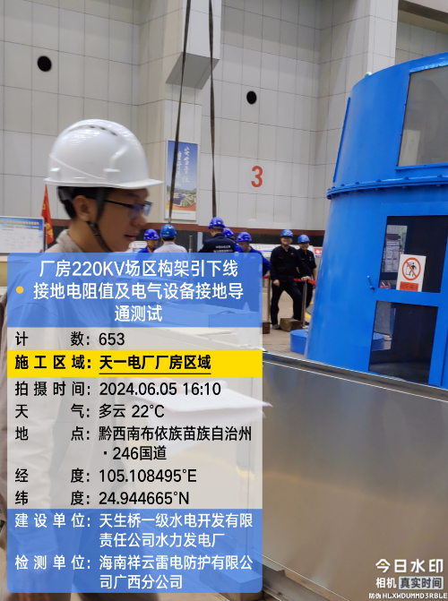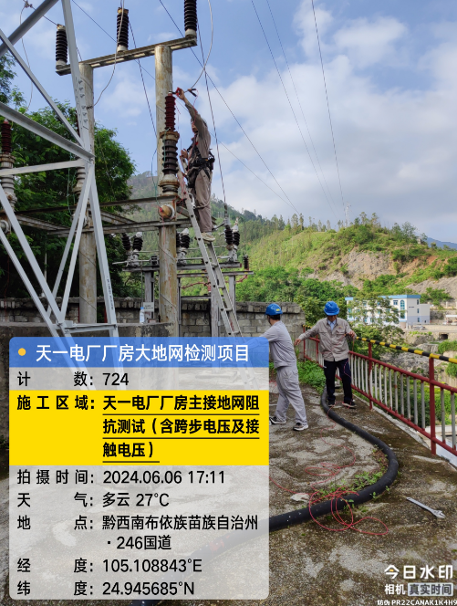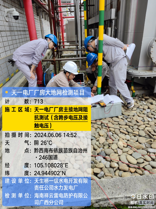 由我公司(海南祥云雷电防护有限公公司广西分公司)中标实施的天一电厂厂房大地网检测项目,我公司技术人员经业主单位2024年6月4日上午三级安全生产考试合格后,6月4日下午开始在厂房区域进行土壤电阻率测试;6月5日对厂房220KV场区构架引下线接地电阻值、电气设备接地以及发电机单机接地导通进行测试;6月6日35KV电天线停电后,对厂房主接地网以及1#-4#变压器的接地电阻值、跨步电压和接触电压等进行测试,完成本项目全部检测工作。详见下图:
