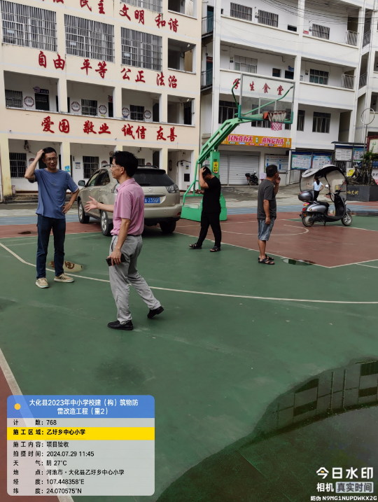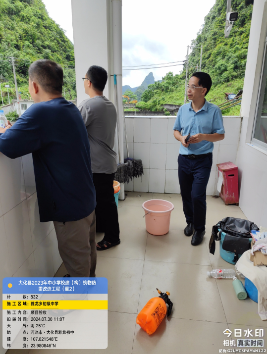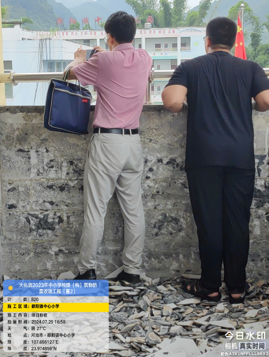 由我公司中标实施的大化瑶族自治县2023中小学校建(构)筑物防雷改造工程(重2),自我方施工人员2024年3月26日进场开始施工,至2024年6月20日历时40个日历天(法定节假日及雨天影响除外)完成九个乡镇14所中小学校的全部施工任务,并通过由建设单位组织会同监理单位、施工单位等相关部门组成联合验收小组于2024年7月29-30日对工程项目进行的竣工验收。详见验收现场图片: