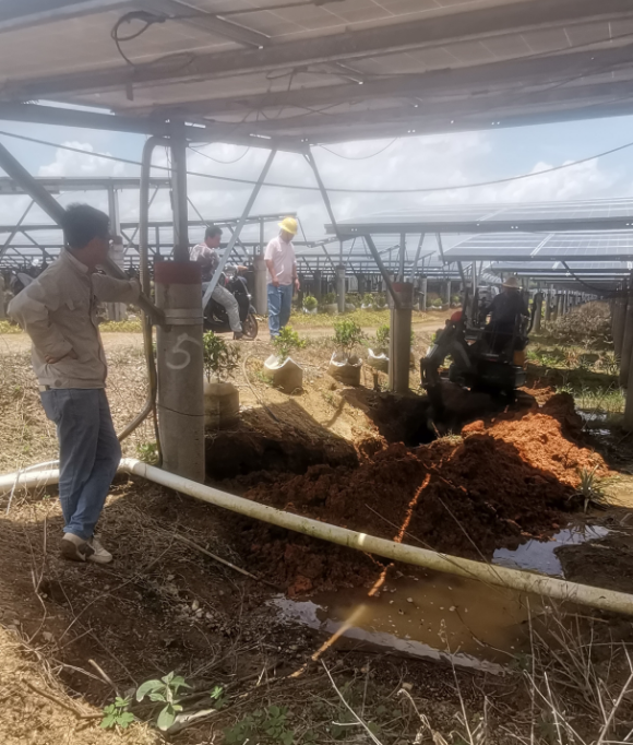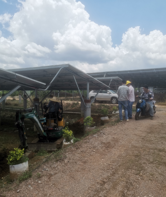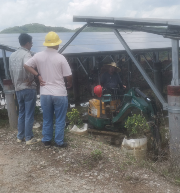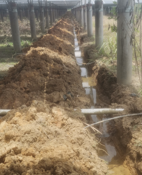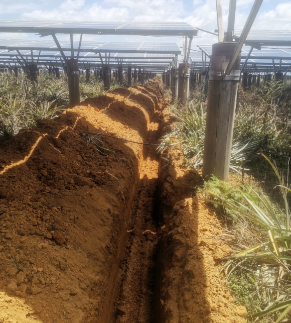 由我公司中标实施的广西鼎旭同辉农业投资有限公司绿色能源光伏发电站防雷接地技改抢修项目,自2023年7月4日正式进场开工以来,接地网沟槽开挖工作进展顺利,全部开挖任务即将完成。详见下图: