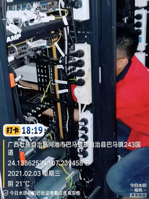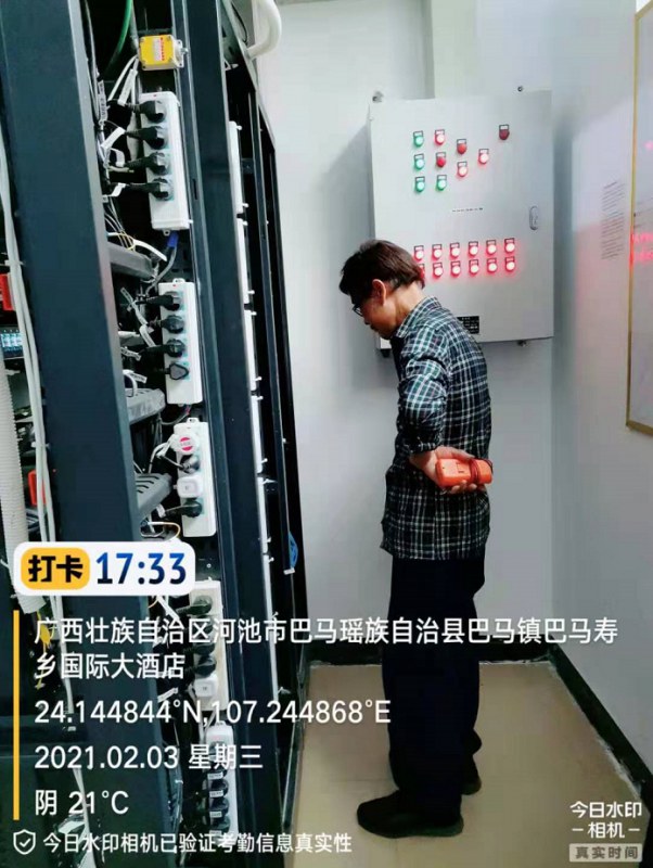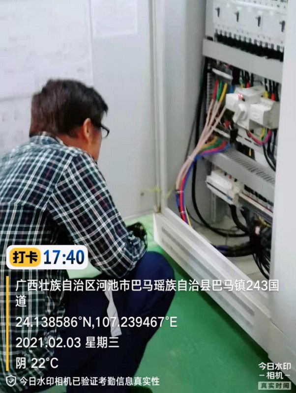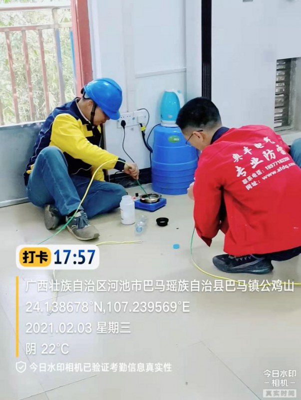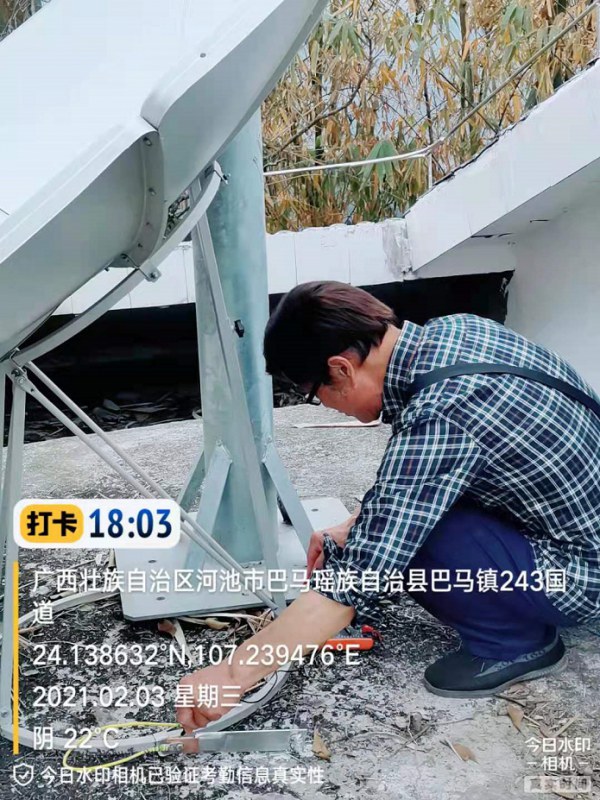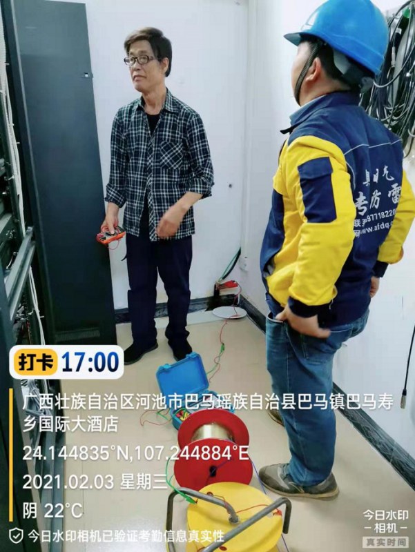 由我公司负责实施的巴马转播台防雷装置整改工程,自2021年1月23日正式进场施工,至2021年2月3日上午完成全部施工,工程进展顺利。下图为施工人员现场进行自检: