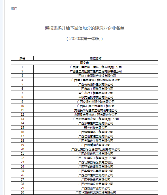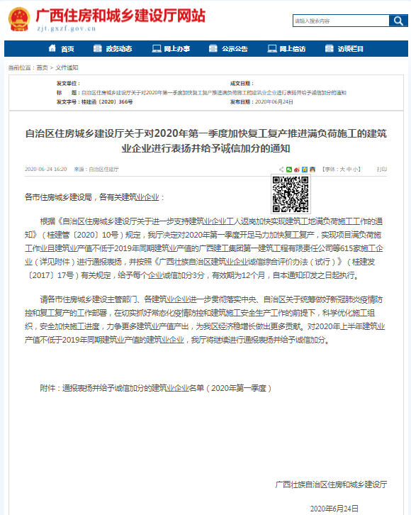我公司于2020年6月24日获得自治区住房城乡建设厅第一季度加快复工复产推进满负荷施工建筑业企业表扬并给予诚信加分。详见下文: