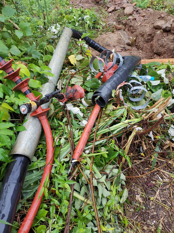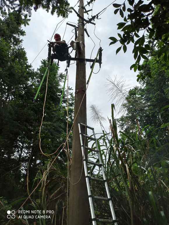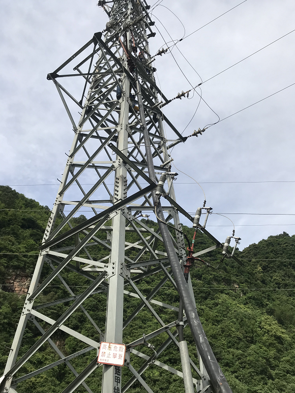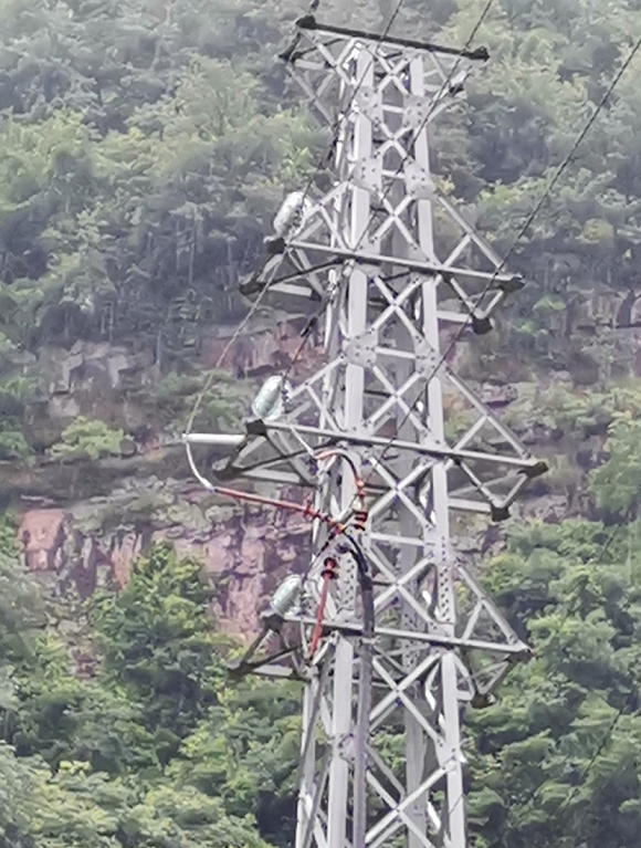应广西桂冠电力股份有限公司金秀分公司的要求,我公司工程技术人员于2020年6月5日-7日对下六甲水力发电厂被雷击穿的终端杆铁塔电力线缆进行抢修。下图为抢修现场: